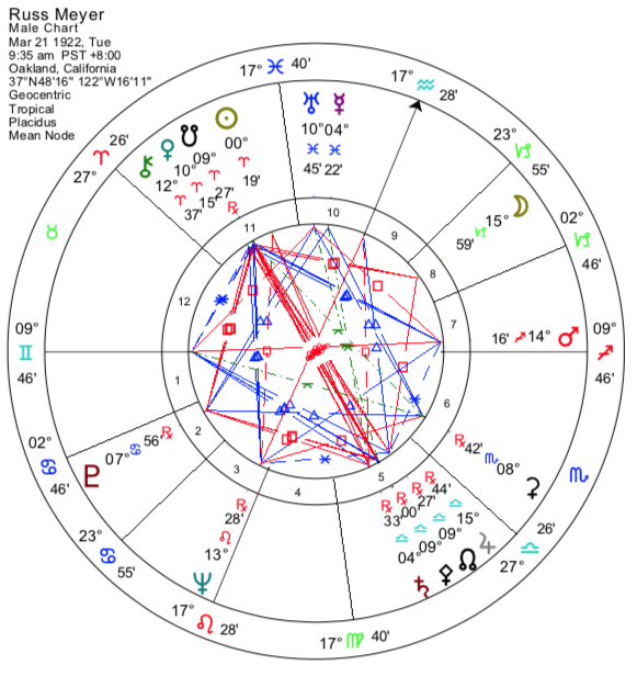 Russ Meyer, 21 Mart 1922, 09:35 PST (+8), Oakland, Kaliforniya, ABD (37N48, 122W16). Kaynak: Frank Clifford tarafından elde edilen doğum belgesinden; kopyası dosyada mevcuttur. RR: AA.