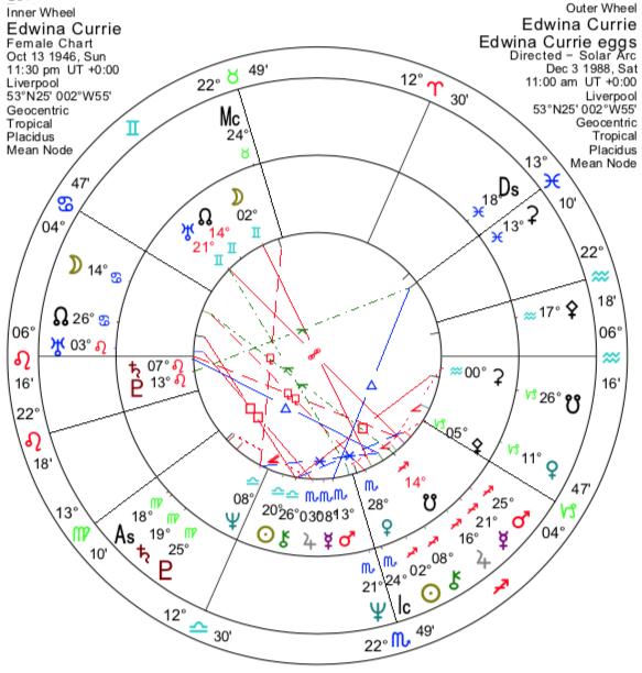 Edwina Currie, 13 Ekim 1946, 23:30 GMT, Liverpool, İngiltere (53N25, 2W55). Kaynak: Currie’nin sekreterinden David Fisher’a, Ocak 1988. RR: A.