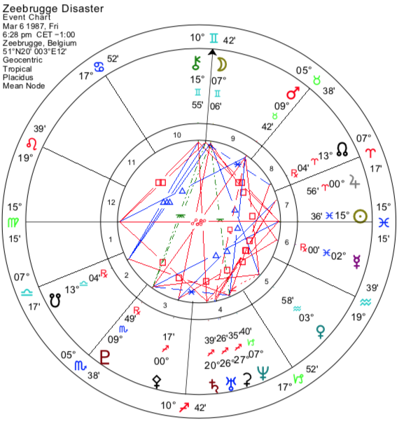 Peki ya Zeebrugge feribot faciası (193 kişinin öldüğü)? Bu, geminin alabora olduğu anın haritasıdır – Yükselen burçta 15° Başak ve 15° Balık Güneş’e dikkat edin (her ikisi de Chiron ile kare açıdadır). Ayrıca Mars, Pluto’nun karşısındadır ve Jüpiter 0° Koç burcundadır (geminin adı The Herald of Free Enterprise idi). Felaketi öngören ve şirketi uyarmaya çalışan Dennis Elwell’in Jüpiter’i 6° İkizler burcunda ve Solar Ark Pluto’su trajedi anında 14°33′ Başak burcundaydı. Titanik’in Jüpiter’in 15° Yay burcunda gerilemesi sırasında denize açıldığını da hatırlıyoruz (ve o gün felaketle ilgili bir dizi başka açı da vardı).