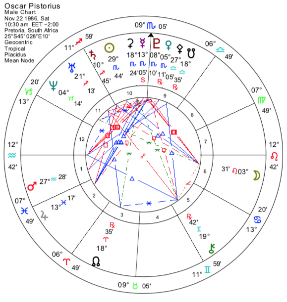 Oscar Pistorius, 22 Kasım 1986, 10:30 EET, Pretoria, Güney Afrika (25S45, 28E12). Kaynak: Pistorius’un teyzesi Philippe Lepoivre’ye, “10:30 ile 11:30 arasında” ve “en doğru tahmin 10:30 – sabah” demiştir.