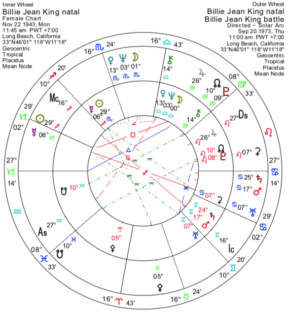 29° Akrep burcundaki Güneş, Billie Jean’in cinsiyet politikası üzerindeki etkisini ve kadın tenisinde sponsorluk (Akrep burcu – başkalarının parası) ve ödül parası üzerindeki etkisini ortaya koyar.