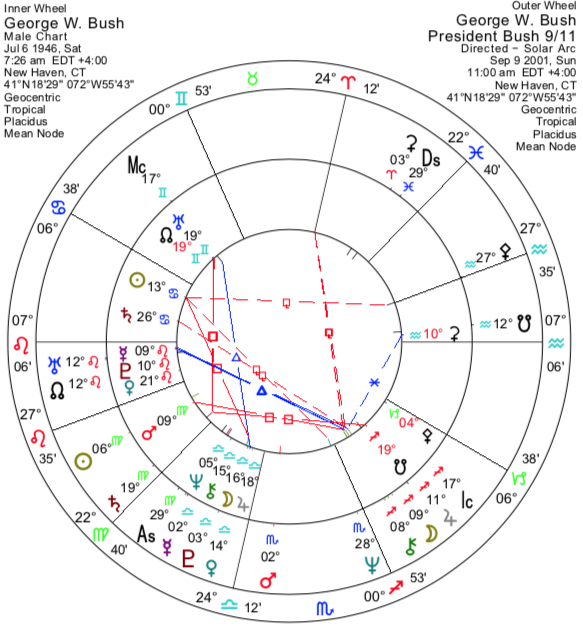 George W Bush’un solar ark Yükseleni, 11 Eylül saldırılarının gerçekleştiği dönemde 29°59′ Başak’taydı (bu derece aynı zamanda Mars’ının bulunduğu burç). Bu, hayatının krizi ve belki de uzun zamandır beklediği andı. Ardından Yükselen Terazi burcuna geçti (orada Ay, Jüpiter ve Neptün yer alıyor) ve bu da yeni bir senaryonun ortaya çıkmasına neden oldu: Milliyetçi coşku ve vatanseverlik dalgası (Ay–Jüpiter); yanlışları düzeltme ve teröristleri adalete teslim etme çabası (Terazi). Neptün’ün gerçek meseleleri ne ölçüde perdelediğini kim bilebilir? Neptün varken, Bush’un içkiyi bırakmak için muhtemelen en kötü haftayı seçtiğini söyleyebiliriz…