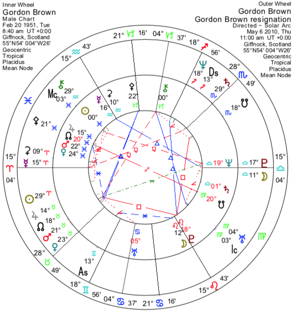 Gordon Brown, başbakanlık hayallerinin gerçekleşmesini uzun süre bekledi. Başbakan olduğunda, Solar Ark MC nihayet Güneş’ine ulaşmıştı; bu, klasik bir liderlik ölçütü ve statüsünde unutulmaz bir değişimin yaşandığı bir Solar Ark yılıydı. 0° Balık burcunda, belki de kurban rolünü oynamak kaderinde vardı. Üç yıl sonra Brown seçim çağrısı yaptı. Bunu bir astrolog olmadan yaptığını varsayıyorum: Transit Pluto onun MC’sindeydi ve Güneşi 29° Koç’a, MC’sinin yöneticisi Satürn ise 29° Akrep’e yönelmişti – büyük bir senaryo değişikliği zamanı gelmişti. Sanırım seçim çağrısı yapmak için yanlış haftayı seçti!