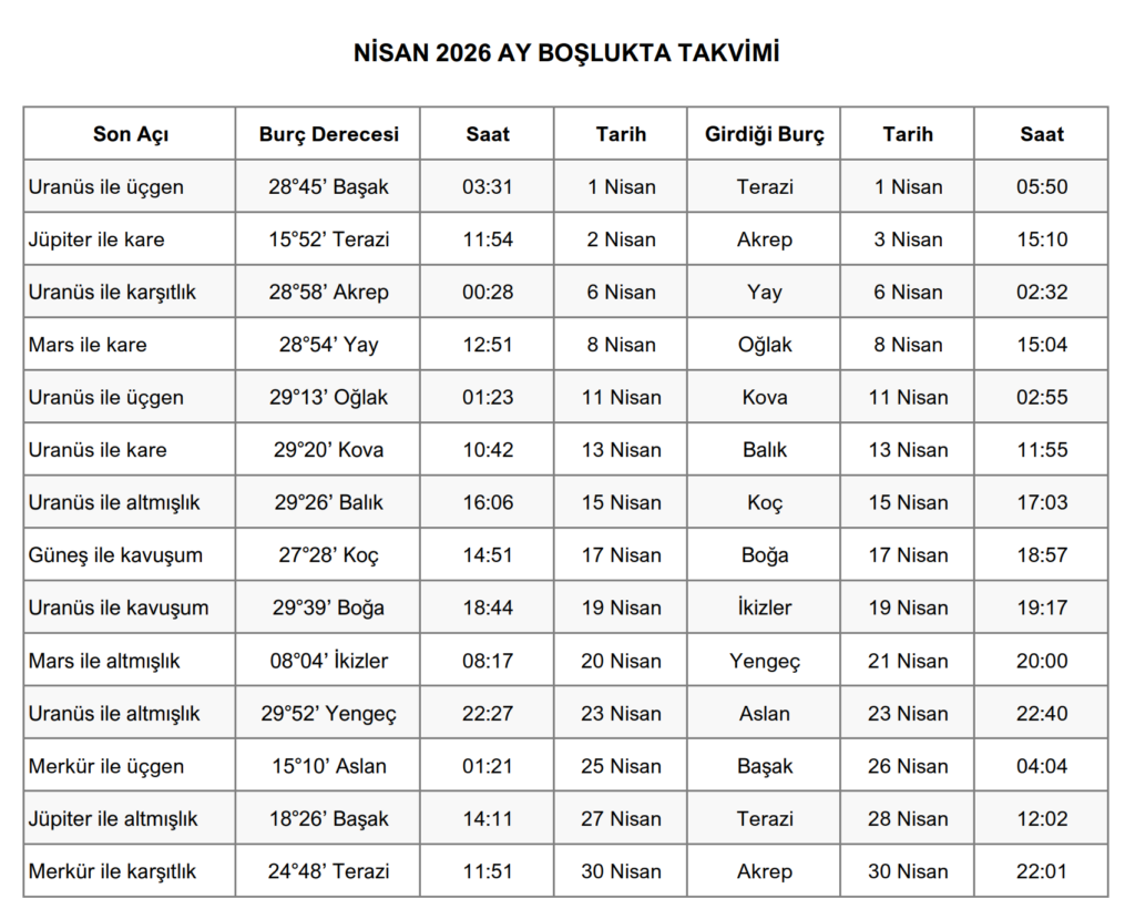 NİSAN 2026 AY BOŞLUKTA TAKVİMİ